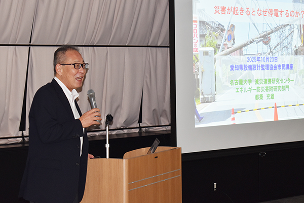 名古屋大学 減災連携研究センター エネルギー防災寄付研究部門特任准教授 都築 充雄 氏より「災害が起きるとなぜ停電するのか?」をテーマとしてご講演をいただきました。
